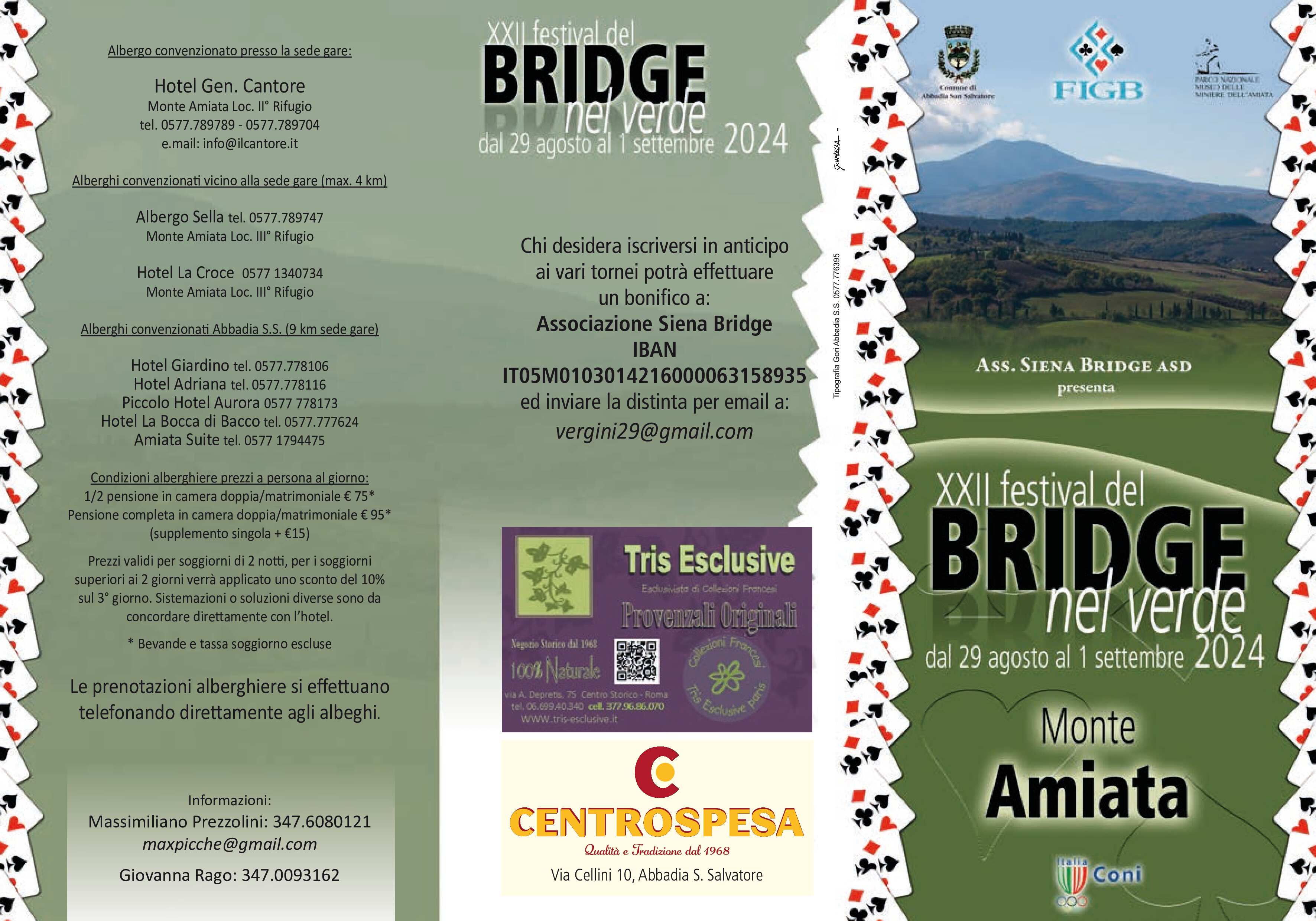 Il Festival del BRIDGE nel verde si terrà dal 29 agosto al primo di settembre 2024 presso l'Hotel Cantore, in località Secondo Rifugio sul Monte Amiata.
